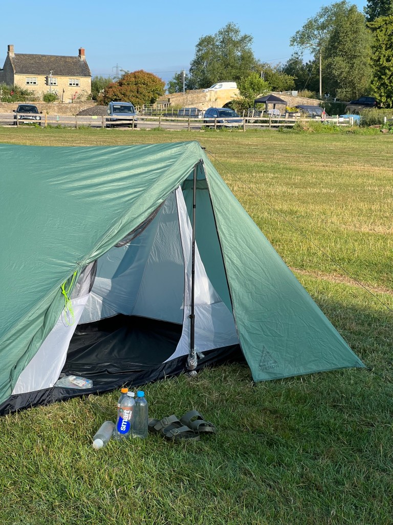 Summer Solstice dawn.Beautiful Radcot Bridge built c1200. Oldest remaining bridge over the river.Hiker next door arrived late last night crawling into this. It weighs 2kg, while my palace weighs 1.1Kg!My ultralight palace which I can sit up in.