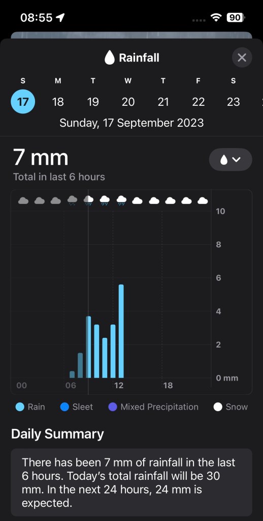 The road outside had water streaming down it. Katy said it’s times like this the village becomes an island – roads flooded at either end.