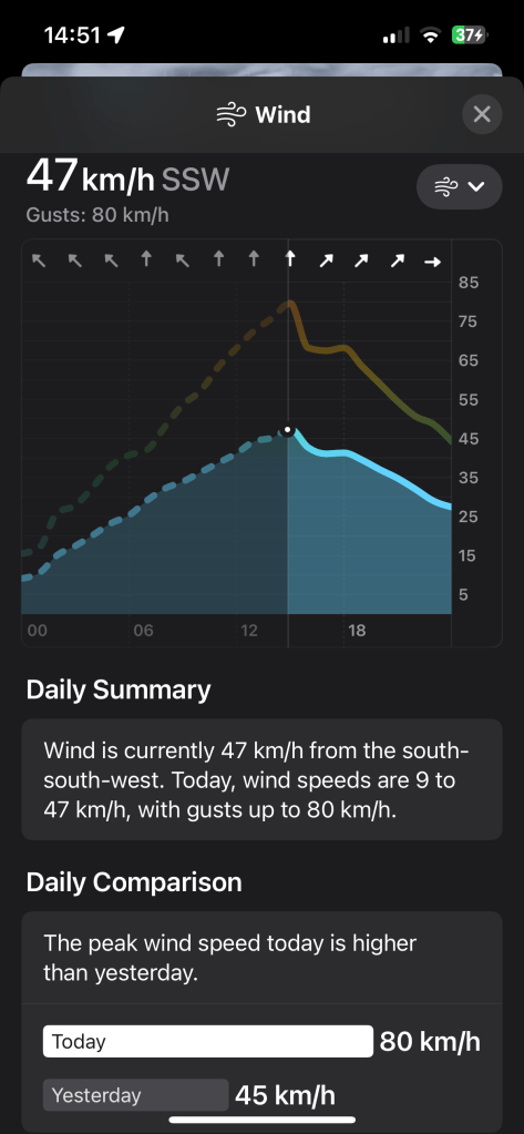 Ferryman is saying ‘essential travel only, and the journey is taking longer than usual and is very choppy’. It’ll get worse later as the effect of the wind offshore brings bigger waves. When I pop out for fish and chips later I’ll give the harbour another turnabout to see how the moored boats are going. Even now they’re wobbling a lot.