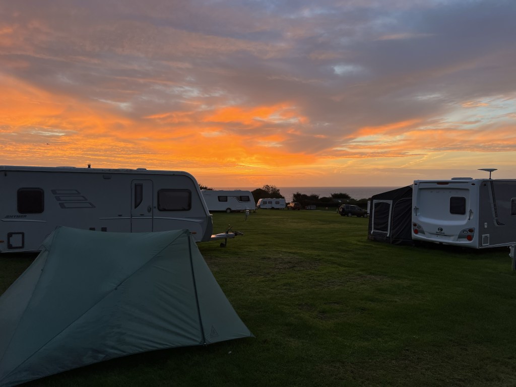 The campsite at Maenporth is a hikers heaven. The only flat bit is carefully made and reserved for us. It has a lookout over the site with table and chairs, just for us. ❤️