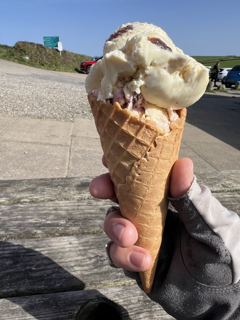 Hell’s Mouth cafe serves me more Callestick ice cream. Again clotted cream and blackcurrant, topped with rum and raisin.