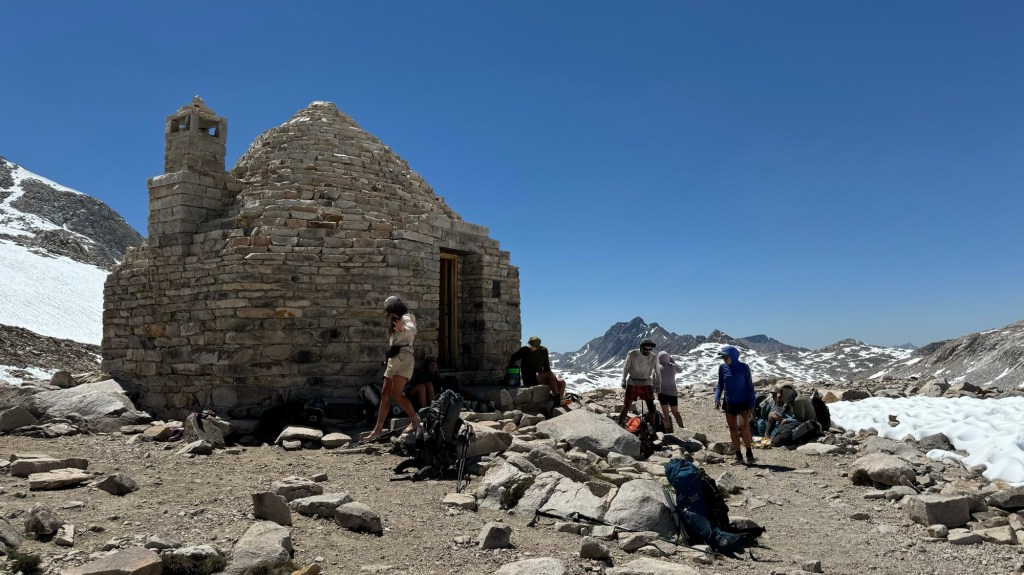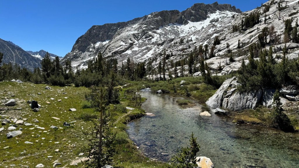 A mega day across Muir Pass – 3200ft of ascent then descent including plugging away across 3.5 miles of snowfields. Snowfields from late morning onwards are a slush-fest following boot track in an unfamiliar gait of length and tightrope foot positioning. Exhausting work.