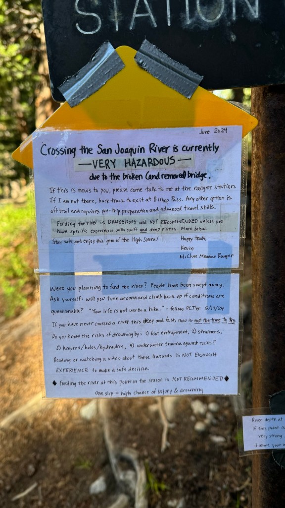 Arriving at the creek before that river I looked in dismay at what seemed to me an in-crossable torrent of water. Others were doing so, both Nobo PCTers and Sobo JMTers, men and women, taller and shorter than me. They said it was tough but doable, but a report came to me from the day before of someone getting swept away before swimming to the bank sealed my fate – over the top it was.