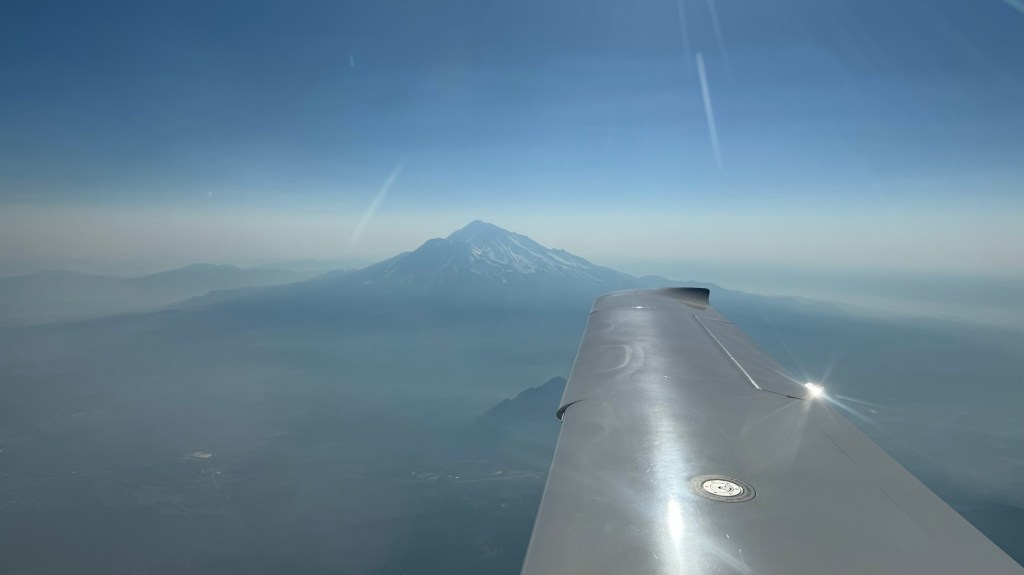 The PCT makes a huge half-circle detour around Shasta. It dominates the views from the trail for over two weeks. We fly over 700 miles of the PCT in 90 minutes.